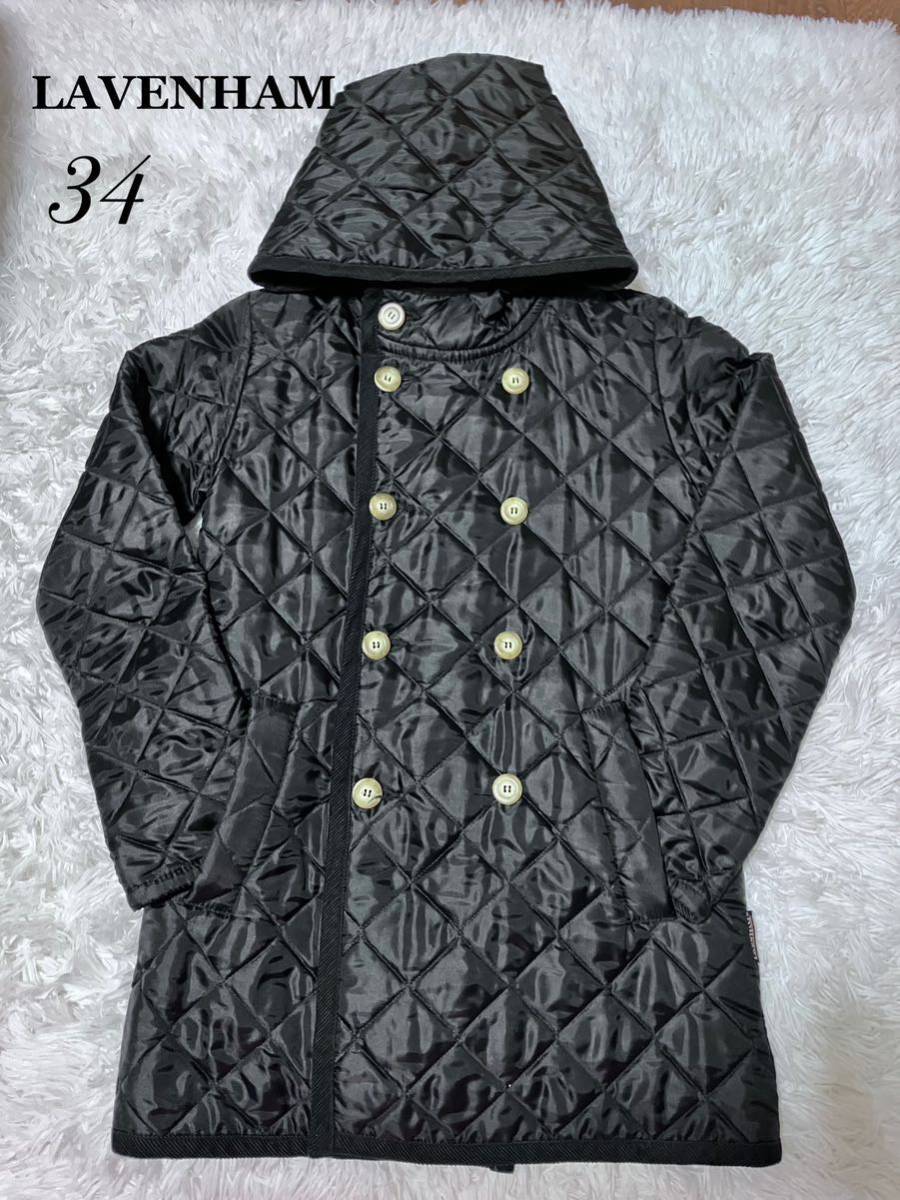 > (難あり)ユーズド ラベンハム 英国 キルティングジャケット フード ダブル釦 黒 LAVENHAM 34(xs以下)