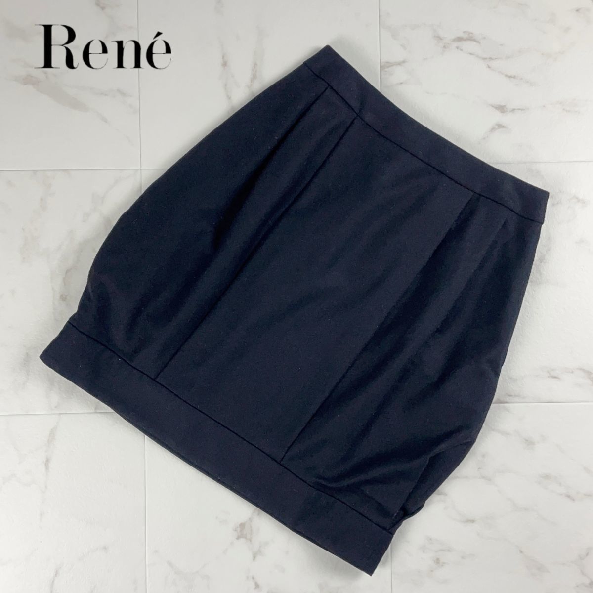 > 美品 Rene ルネ カシミヤ混 ウール デザインタック 膝丈バルーンスカート 裏地あり レディース ボトムス 黒 ブラック サイズ36*LC310
