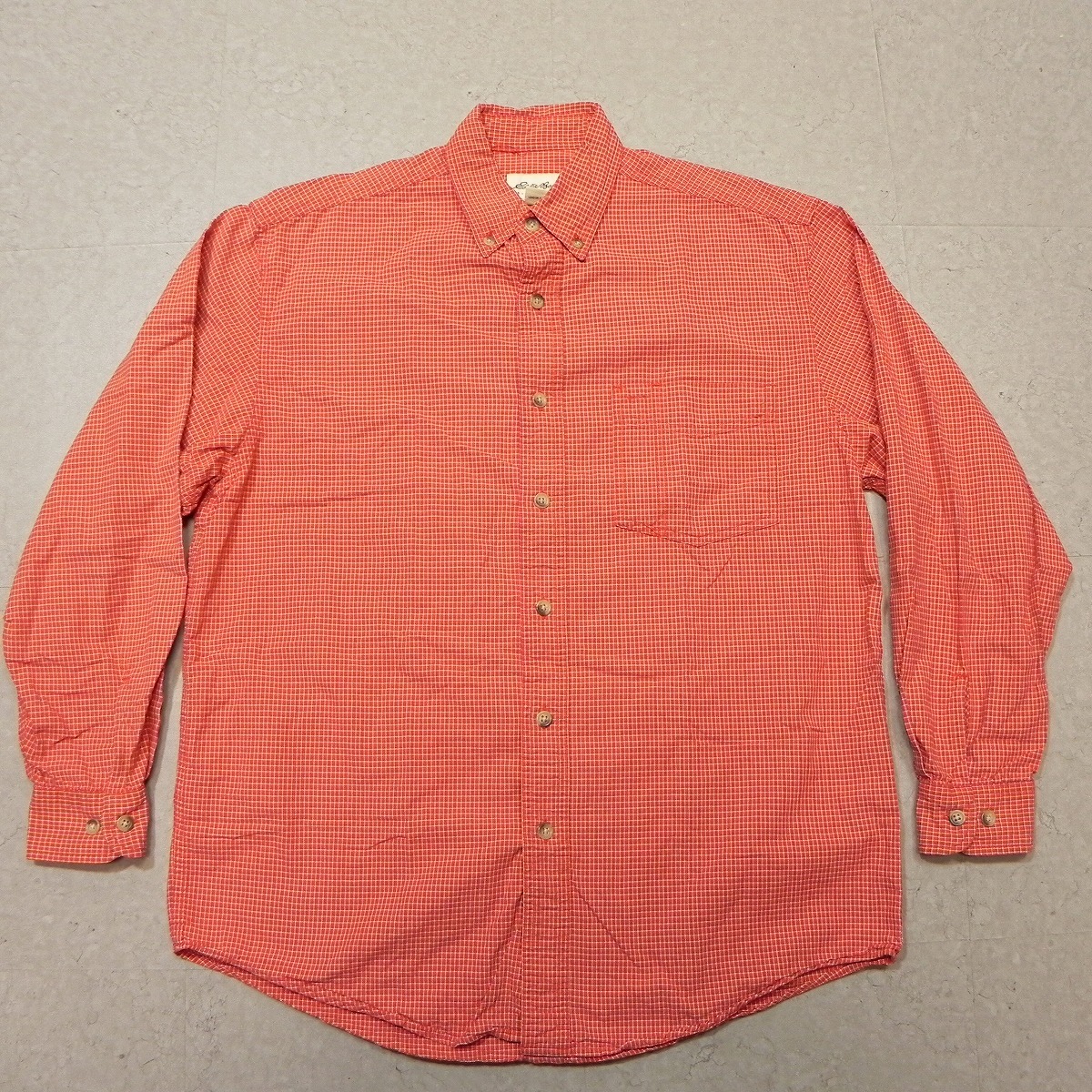 > 90s Eddie Bauer チェック ボタンダウン コットン100 シャツ S/P エディーバウアー 白タグ 長袖 BD 赤系 古着 即決 ★a