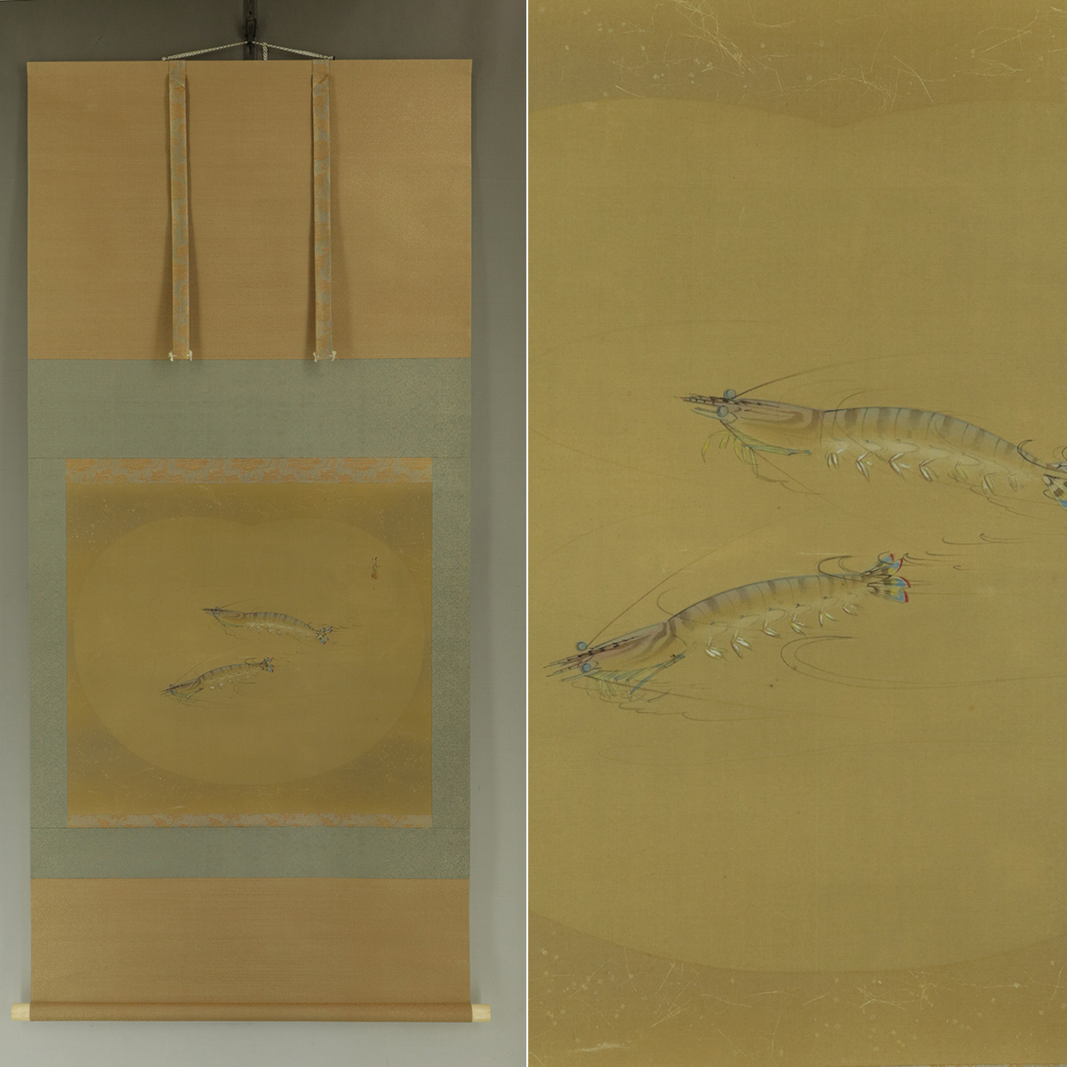 - 【肉筆】保舟銘【車海老】◆絹本◆共箱◆掛軸 t04124