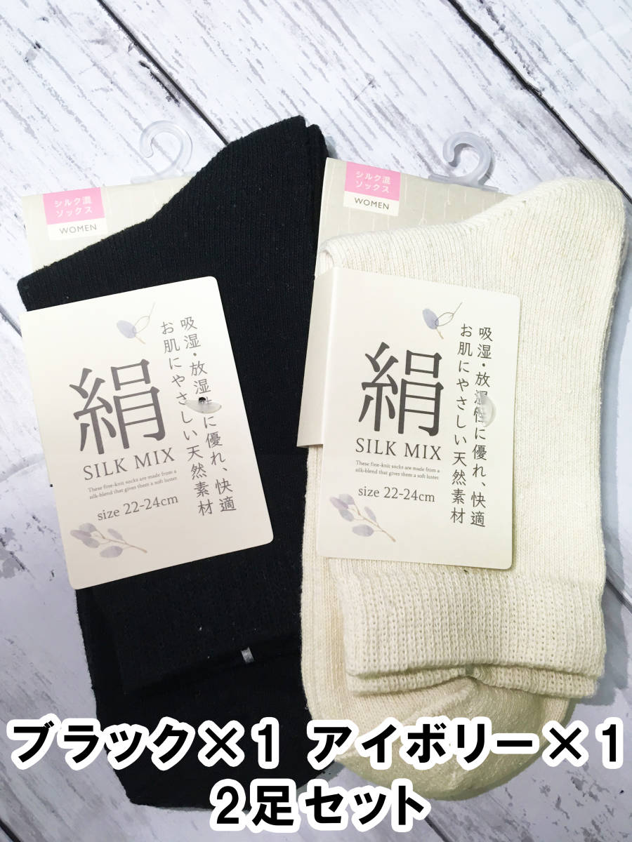 - □送料無料 新品 靴下 無地 レディース クルー丈 ソックス ブラック アイボリー セット売り 絹 シルク 混 通気性 保温 蒸れにくい 22