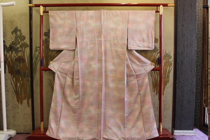 > きもの今昔6394 小紋のきもの 広衿袷手縫い仕立て 正絹綸子地 すすき地紋肌色群雲ボカシ梅の花小紋 身丈159cm