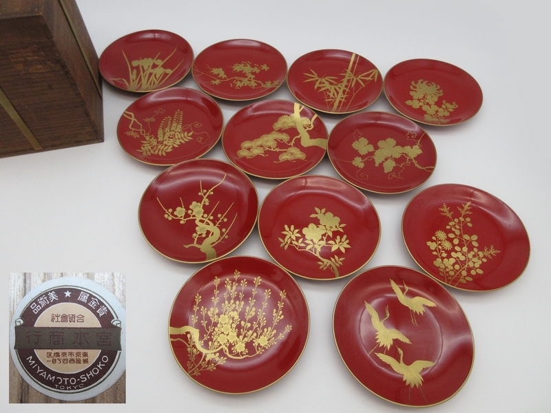 - 木皿 ■ 銘々皿 [ 図変わり 絵変わり] 金縁朱塗 蒔絵[ 松竹梅 蔓 藤 菊 杜若 他 ]12客 ■ 天然木 菓子皿 茶道具 木箱入り №9427■