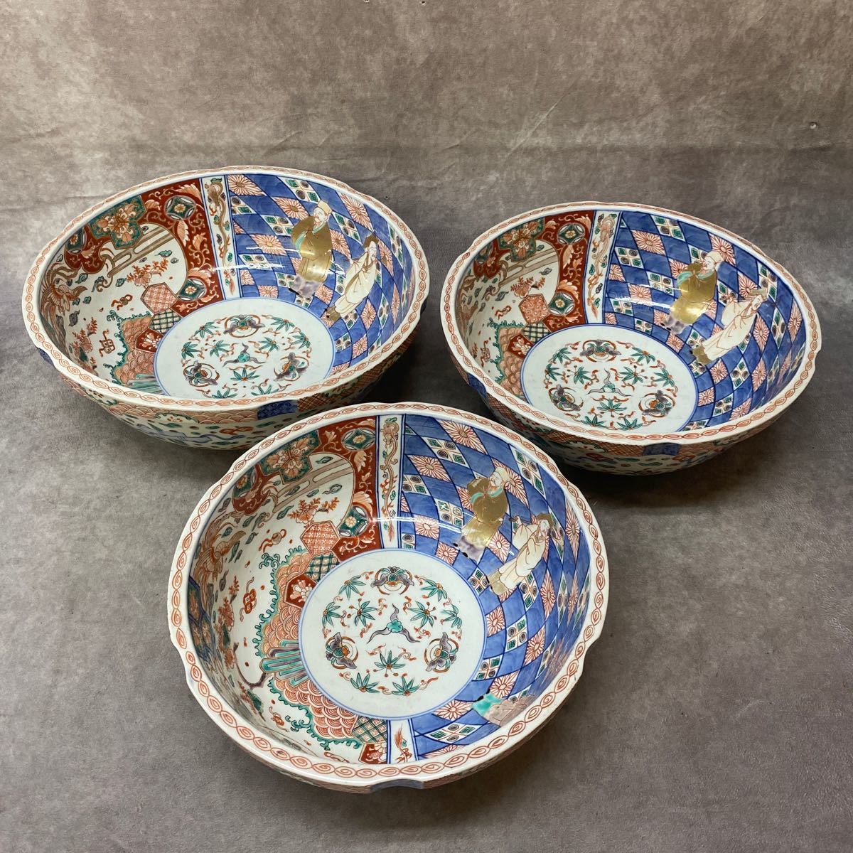 - 時代物 明治 大正 富貴長春 冨貴長春 大鉢 3点 三つ鉢 揃え 色絵 金彩 中国 旧家蔵出 大中小 赤絵 染錦 古玩 古い 古渡 窯傷 虫食い 骨董