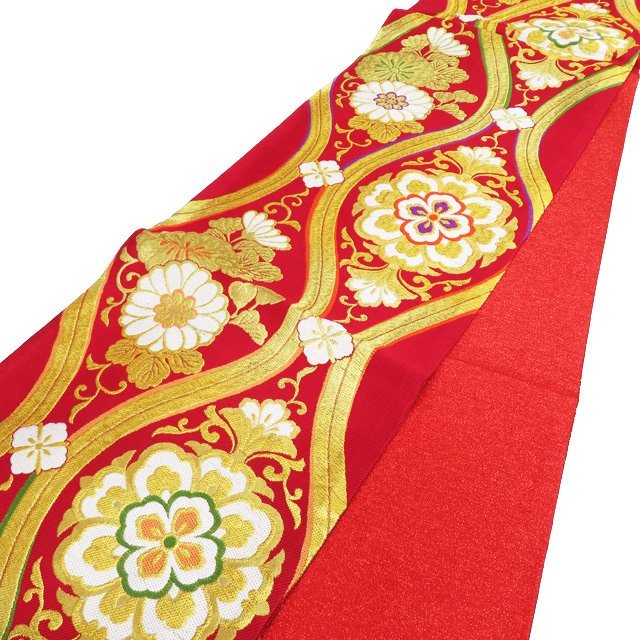 - 袋帯 振袖用 中古 リサイクル 正絹 フォーマル 仕立て上がり 六通 花立涌文 菊 箔糸 赤色 多色 金 きもの北條 A978-5