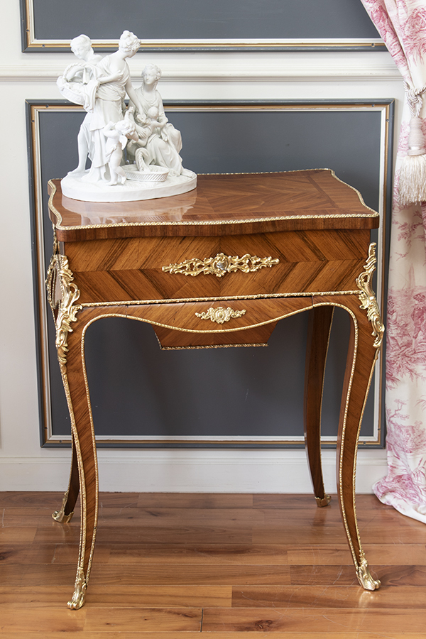 まず目を惹くのが、ローズウッドを贅沢に使った寄木模様。美しいローズウッドの色と木目は高級フランスアンティーク家具の象徴だと言っても過言ではなく、このほんのりしたピンク色はファンを虜にし続けています。