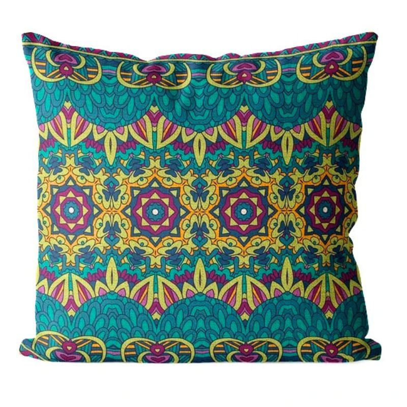 - 緑 ボヘミアン 曼荼羅 クッションカバー 45×45cm 派手 インテリア 正方形 麻生地 リネン 1枚【color 05】