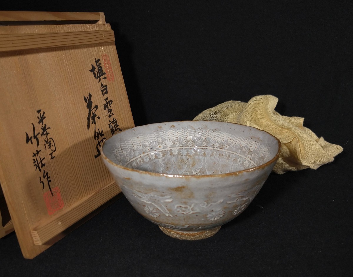> 京焼 平安竹荘 「真白雲鶴紋茶碗」 花文 雲に鶴図 茶碗 共箱 黄布 茶道具 b-68(04下)b3411