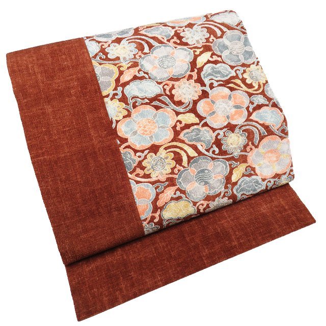 > 名古屋帯 なごや帯 中古 リサイクル 正絹 カジュアル 仕立て上がり 全通 縮緬地 ちりめん 花模様 茶色 多色 きもの北條 A984-13