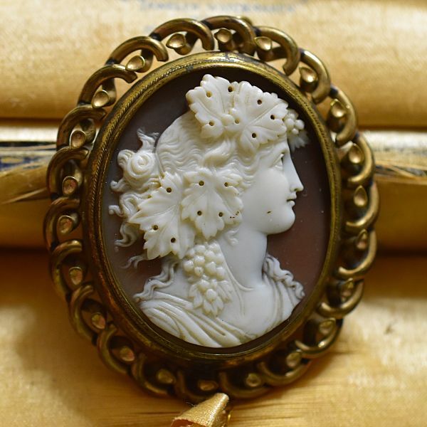 > アンティーク 回転式ロケット 葡萄 バッカスの巫女バッカンテ シェルカメオブローチ 手彫り レポゼ細工 19世紀 ヴィクトリアン 本物保証