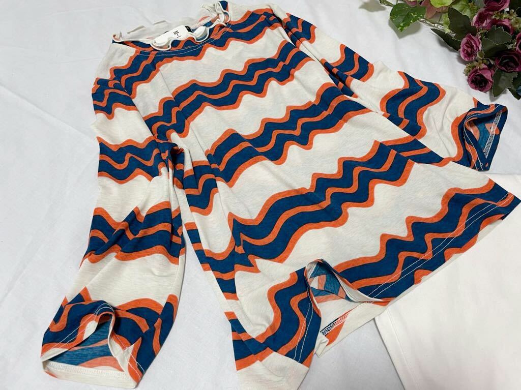 - f■M~L■新品■衿フリフリお洒落*波柄ストレッチ性七分袖カットソー■アイボリー&オレンジ