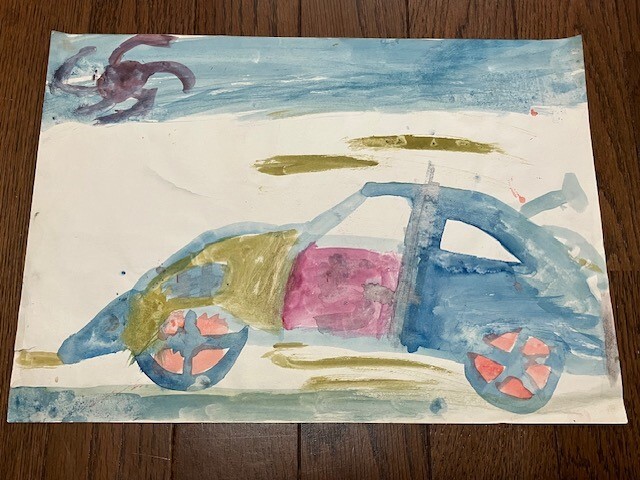 - 水彩画 車 ワーゲン・ビートル ポルシェ 大径ホイール リアスポイラー 横35.9㎝ 縦25.3㎝ 昭和44年 当時物 幼稚園児作 送料無料