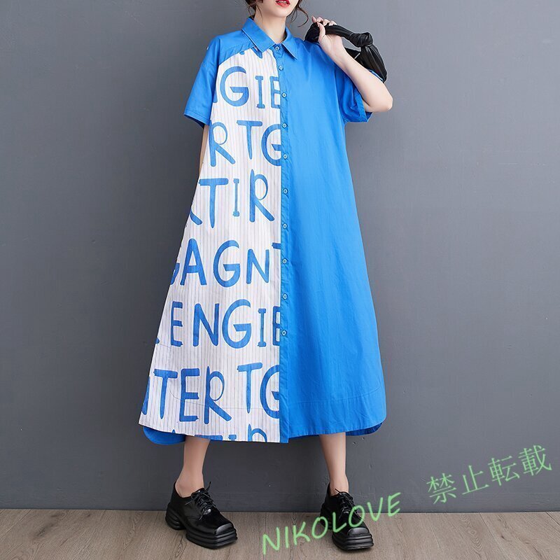 - LB996 Fサイズ 夏 上質 ロングワンピース 半袖 体型カバー 英語文字 切り替え レディース シャツワンピース おしゃれ ブルー