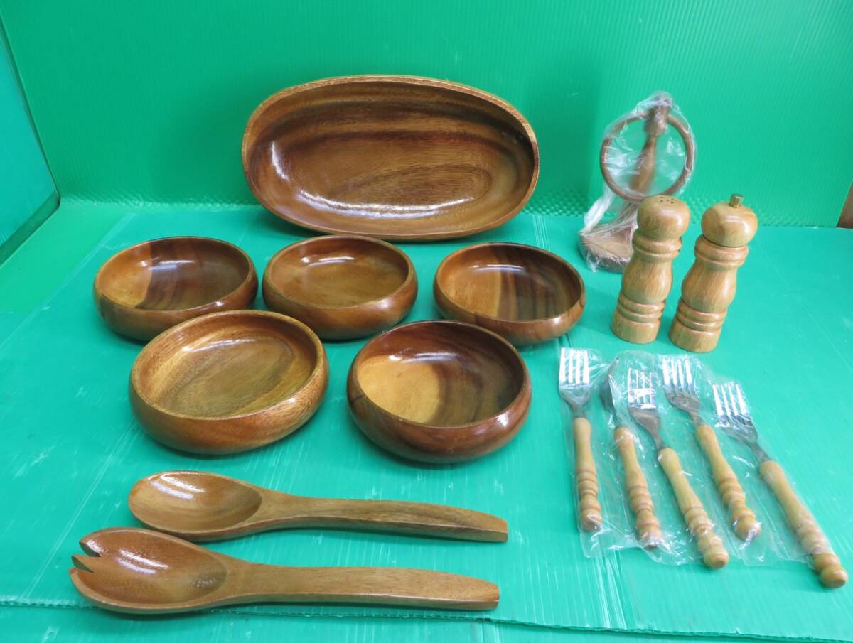 > N-107■木製 サラダボール/取り皿5枚/サーバー(スプーン&フォーク) /塩コショウ入れ/フォーク5本/マヨネーズ立て 未使用