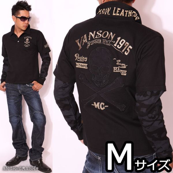 - 当店別注 VANSON バンソン フェイクレイヤード 長袖 ポロシャツ ブラック×袖ブラックカモ【Mサイズ 】NVPS-519 バイカー アメカジ 刺繍