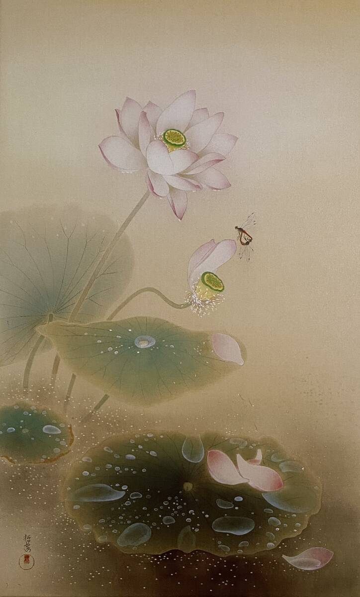 - 花岡哲象、〈蓮池蜻蛉〉、希少画集画、高級新品額・額装付、状態良好、送料無料