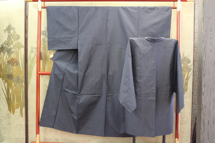 > きもの今昔6969 男の和服 高級絣の着物と羽織アンサンブル 黒に近い地糸に青グレーの絣 きもの丈139CM