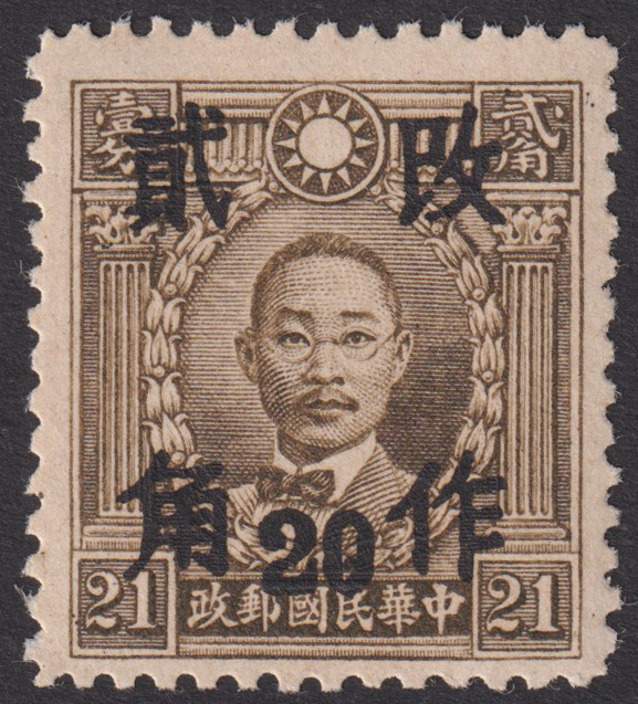 - 旧中国切手 1943年2月 改作二角(20分)票 湖南 香港版烈士すかし無 21分 未使用 JPS:712 Chan:698 1424