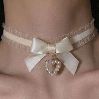 - ロリータ 量産 ハート フェイクパール チュール リボン チョーカー アイボリー