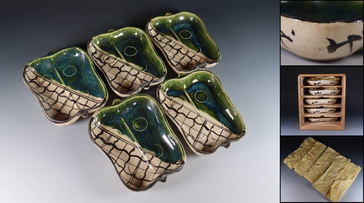 - 蔵出し品 古織部 江戸初期 軍配形 皿 5枚 A087
