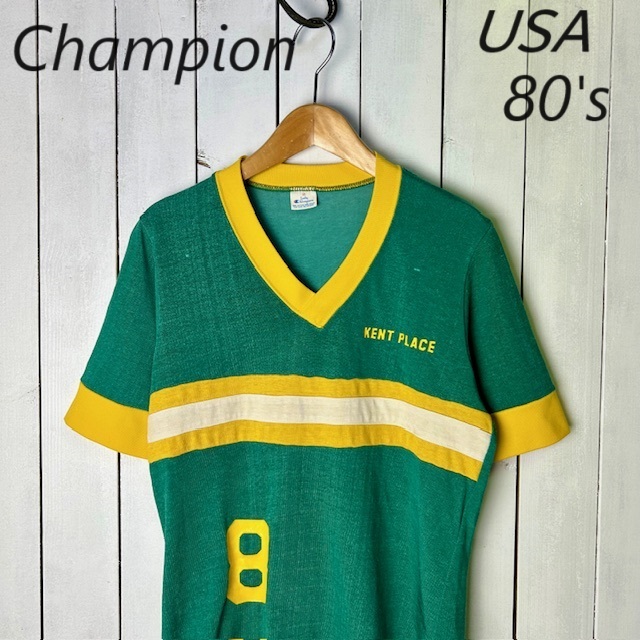 > T●142 USA古着 80s USA製 チャンピオン トリコタグ Vネック ナンバリングTシャツ M 緑 オールド ヴィンテージ シングル ゲームシャツ