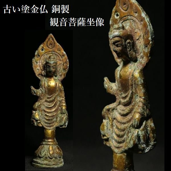【 恵 #1149 】 古い塗金仏 銅製 観音菩薩坐像 仏教美術 仏像 置物拍卖