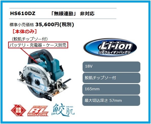 - マキタ 165mm 18V 充電式マルノコ HS610DZ (本体のみ)【無線連動非対応】