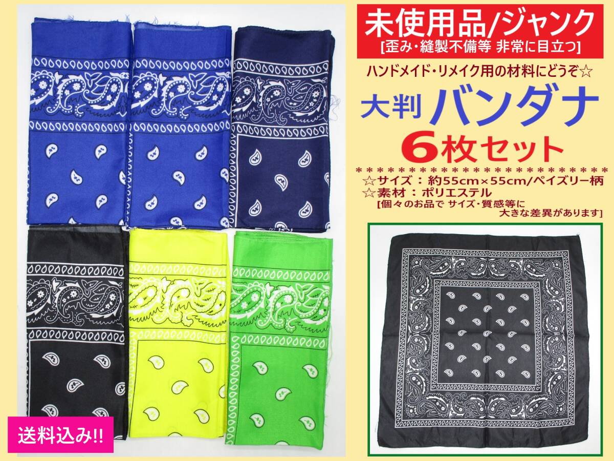 > ジャンク 未使用 大判 バンダナ 6枚セット D 歪み 縫製不備 非常に目立つ ペイズリー 約55cm×55cm カラー スカーフ 布 生地 材料 リメイク