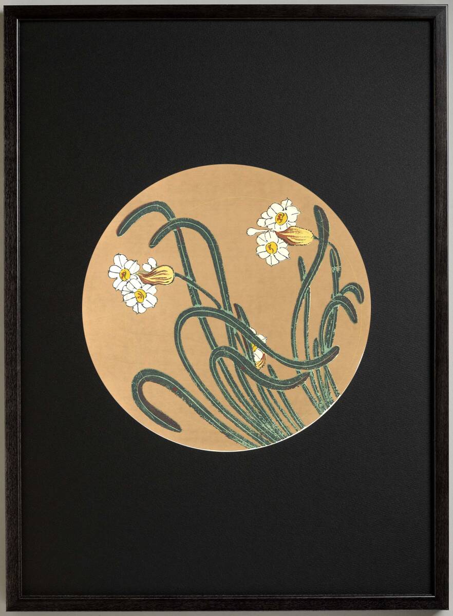 - 真作保証 若冲用丸窓額入り 伊藤若冲 格天井花画 木版画 水仙 初版 明治期 若冲の晩年の作品を木版画で楽しむ!!