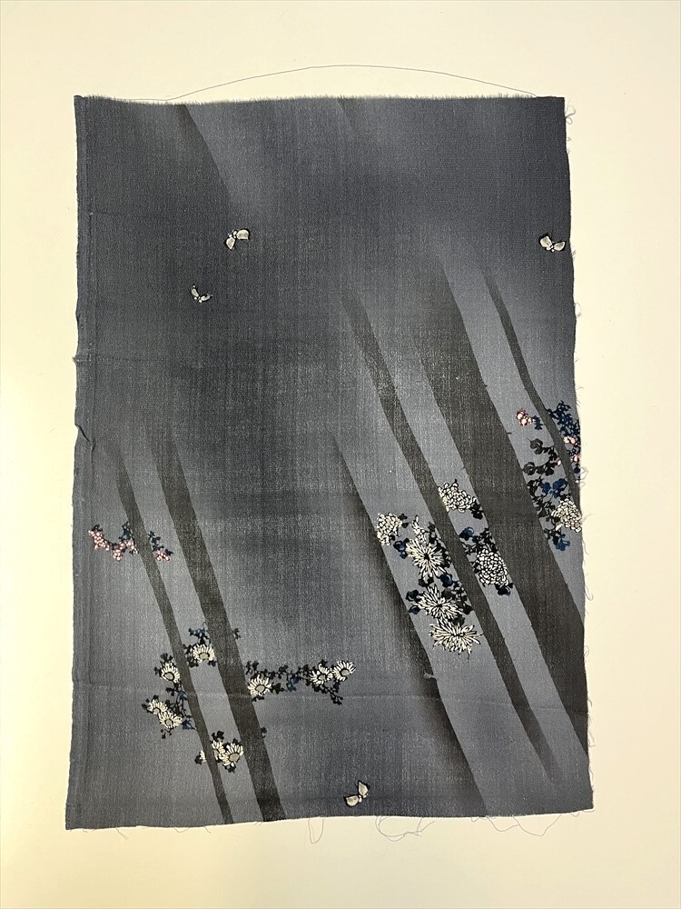 - 花とら●アンティーク端切れ 濃灰 菊 蝶 ちりめん リメイク 素材 細工用 240505-04