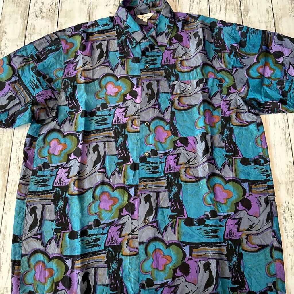 - Jalon 総柄 柄シャツ シルクシャツ 花柄 レトロ アート ビンテージ 半袖シャツ 絹100%