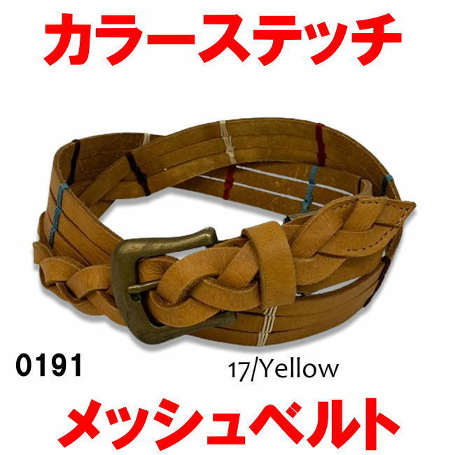 - イエロー 0191 30mm カラーステッチ メッシュ ベルト 本革 牛革 メンズ レディース
