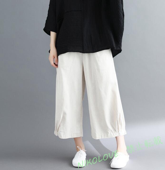 - 新品ワイドパンツ ガウチョパンツ レディース ボトムス ゆったり 綿麻 無地 ポケット付き ベージュ L-XL LE572