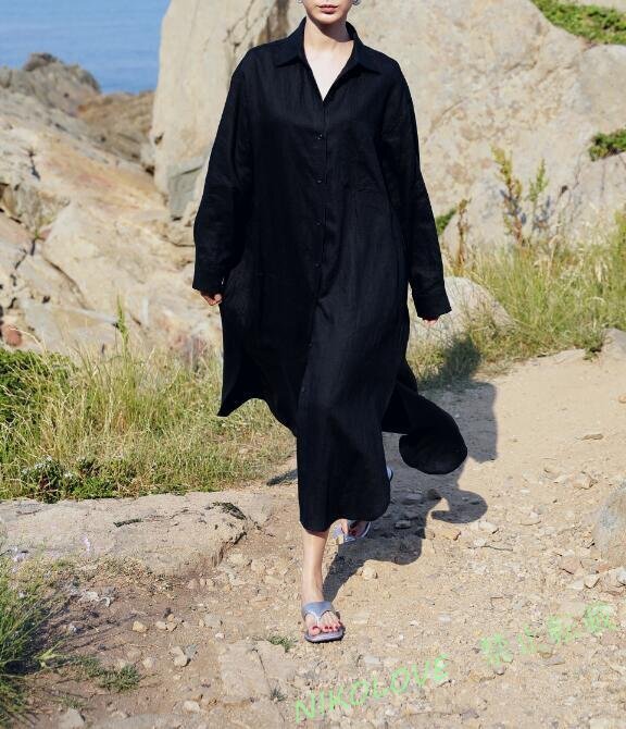 - 新品シャツワンピース レディース マキシワンピース リネン風ワンピース 体型カバー 大きいサイズ 黒 S~XL LH427