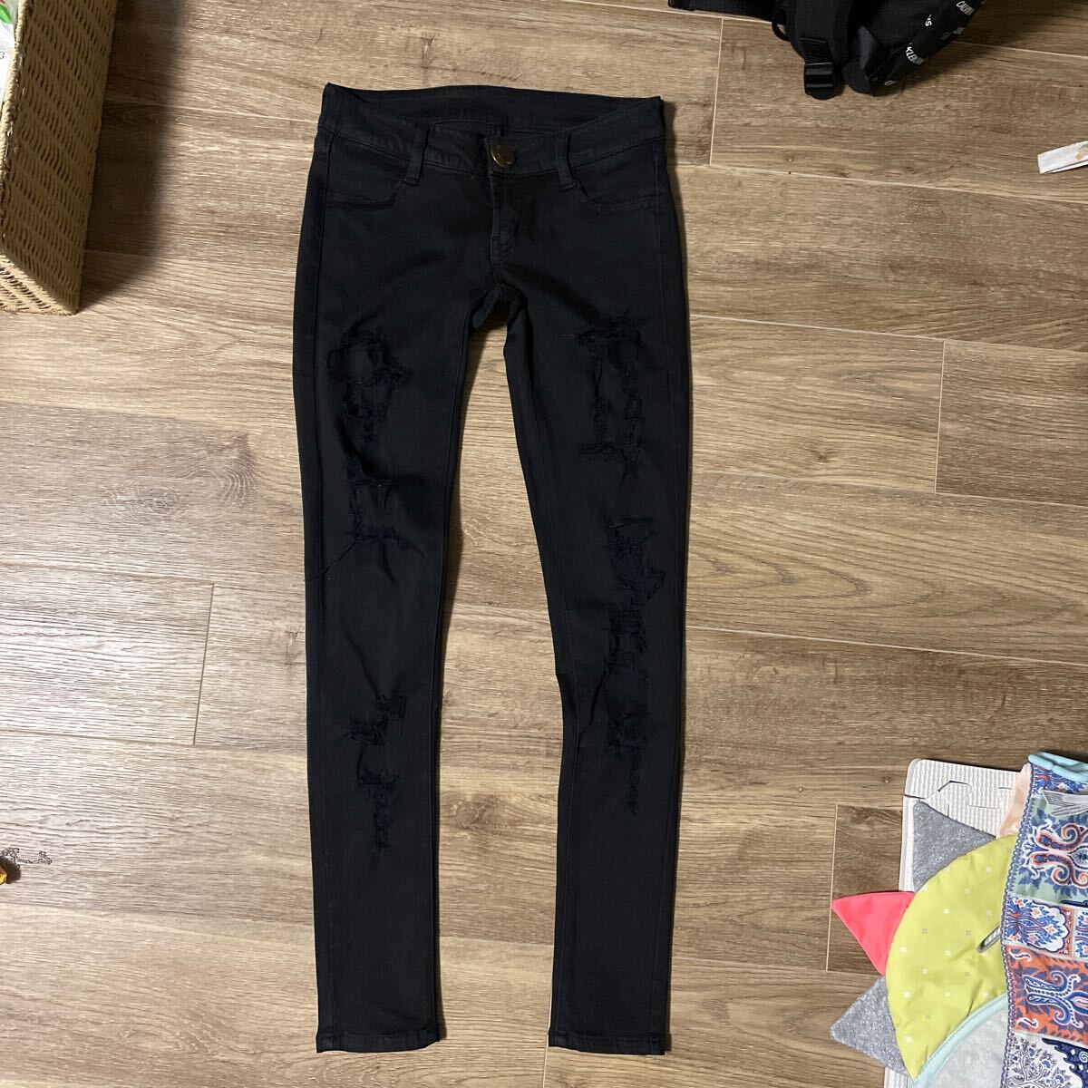 > パンツ スキニー ストレッチ ブラック ムルーア MURUA ダメージ加工 1度飲み着用