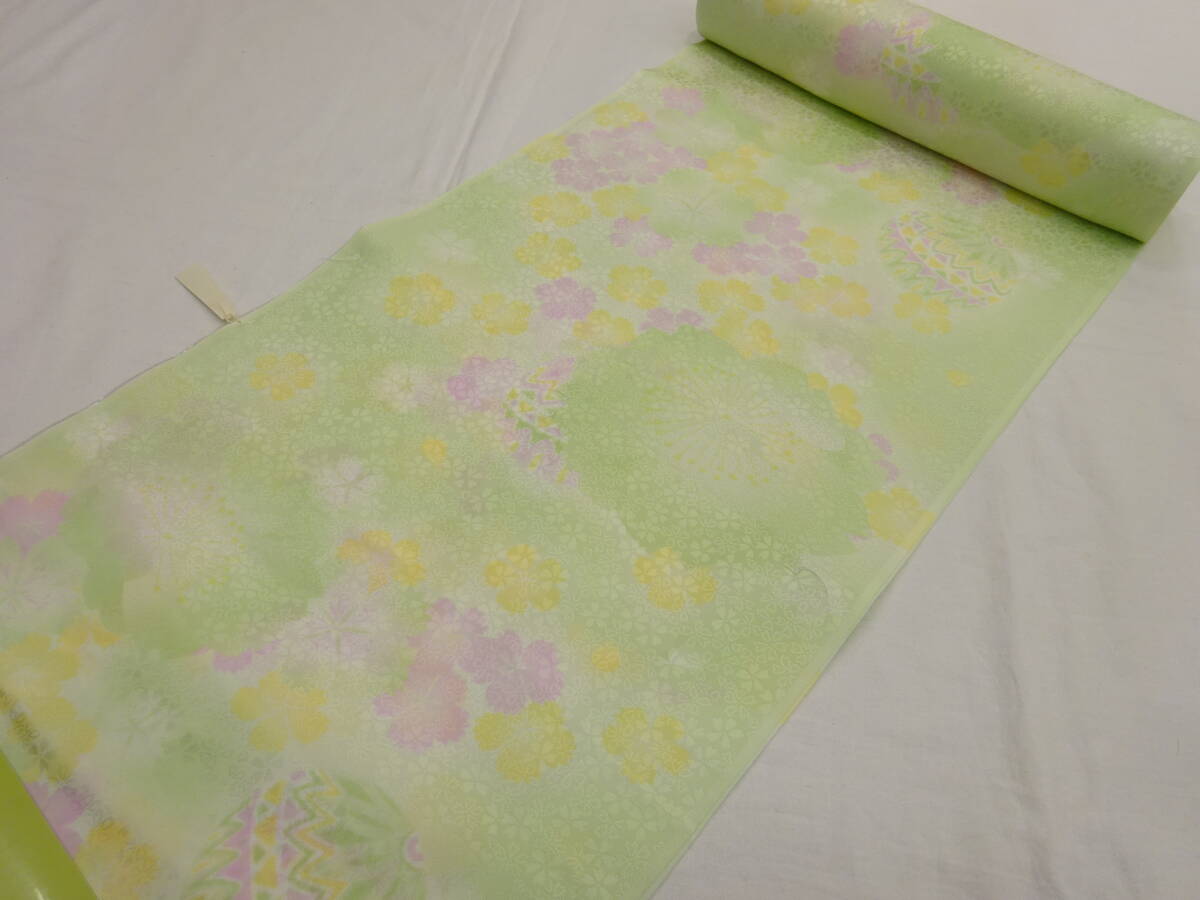 - 新品・正絹・反物★幅広39㎝・振袖用長襦袢★グリーン色地に桜と鞠柄です