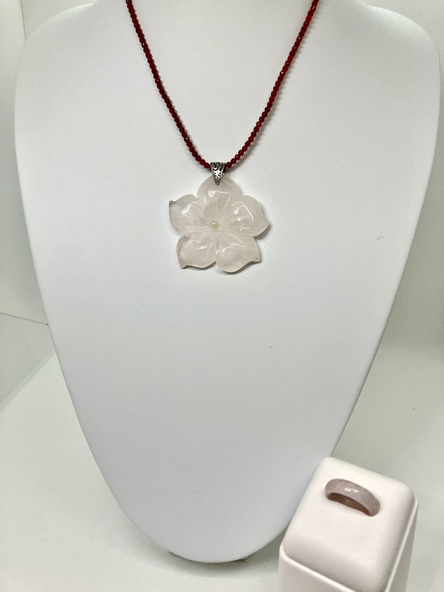 - 【新品】ローズクォーツ花模様ネックレス&リング二点セット/水晶/桜模様/大ぶり/ローズクォーツ/天然ネックレス/カービング/甲丸リング