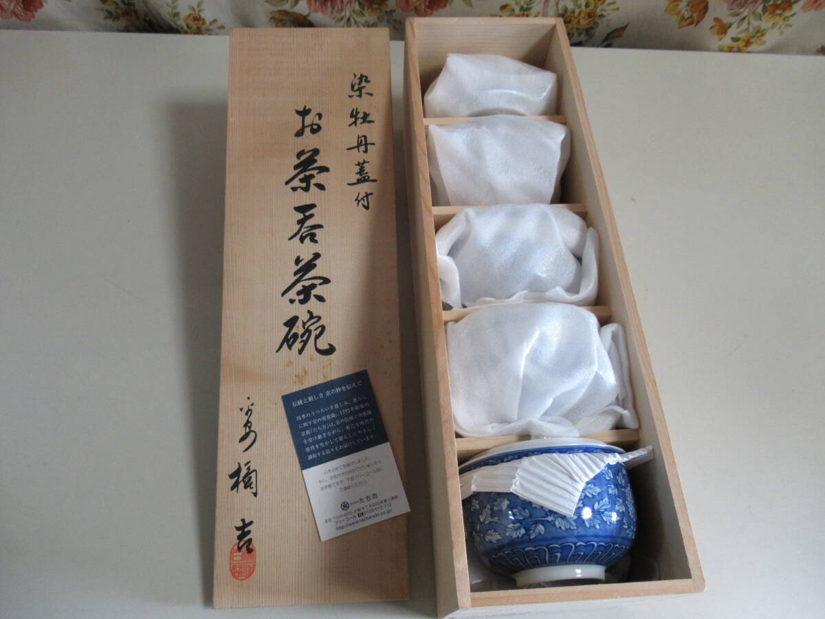 - R6 06★たち吉/お茶呑茶碗 染牡丹ふた付 湯のみ 5客 未使用共箱入