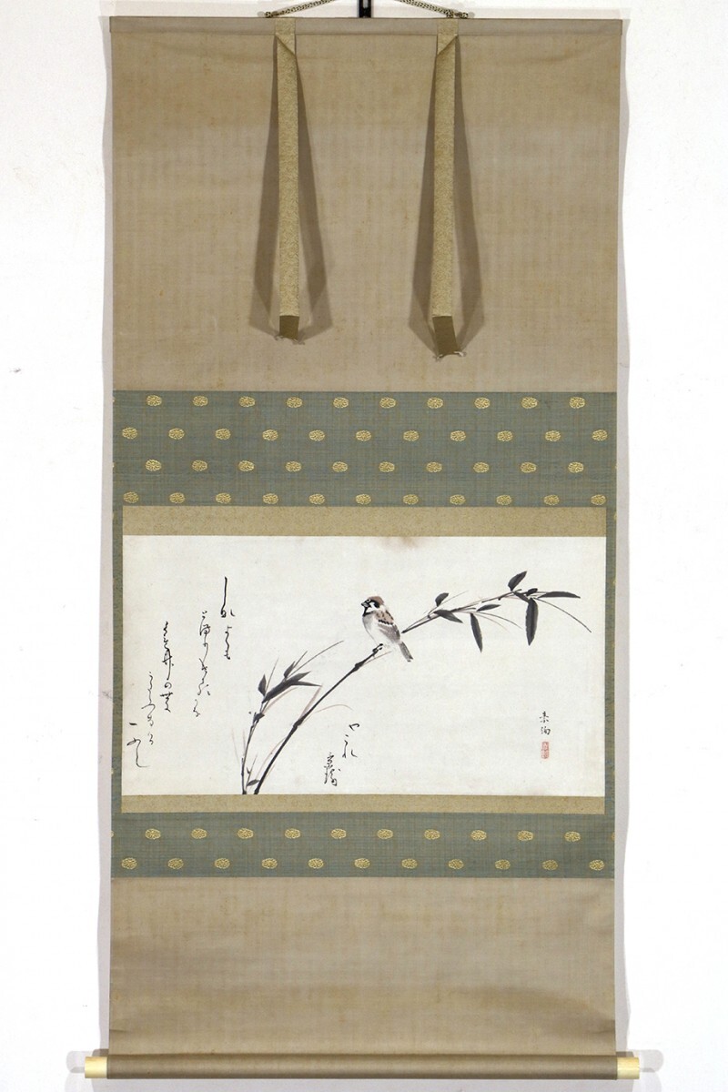 - 【真作 江戸動物画】掛軸「山口素絢画 香川景樹賛 竹雀図」阪正臣箱書 二重箱 江戸中期後期 円山派絵師 応門十哲 歌人 書画