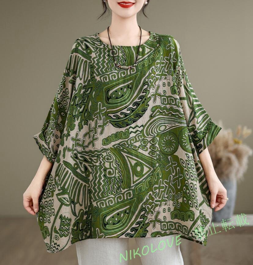- 新品 夏 ドルマン袖 ロング ブラウス レディース トップス プリント柄 大きいサイズ ゆったり 可愛い カジュアル チュニック G LG746