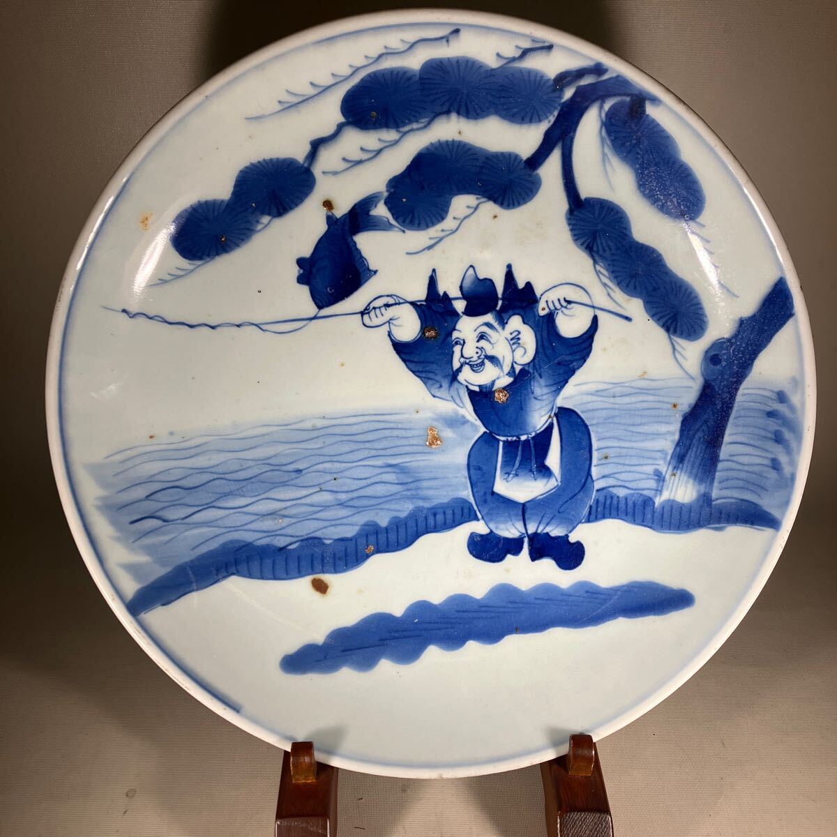 - 志田窯 恵比寿様 鯛釣り図 大皿 (江戸後期) 染付 骨董 古美術品 古美術 民藝