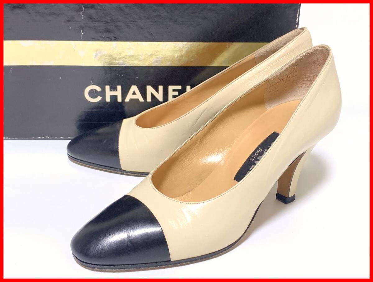 - 即決 CHANEL シャネル 35≒22cm パンプス バイカラー 箱付 レザー レディース mcu