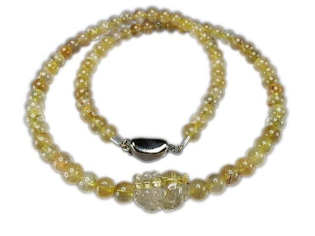 - タイチン入り中型ヒキュウ手彫りゴールドルチルクォーツ約6mm天然石ネックレスプライム