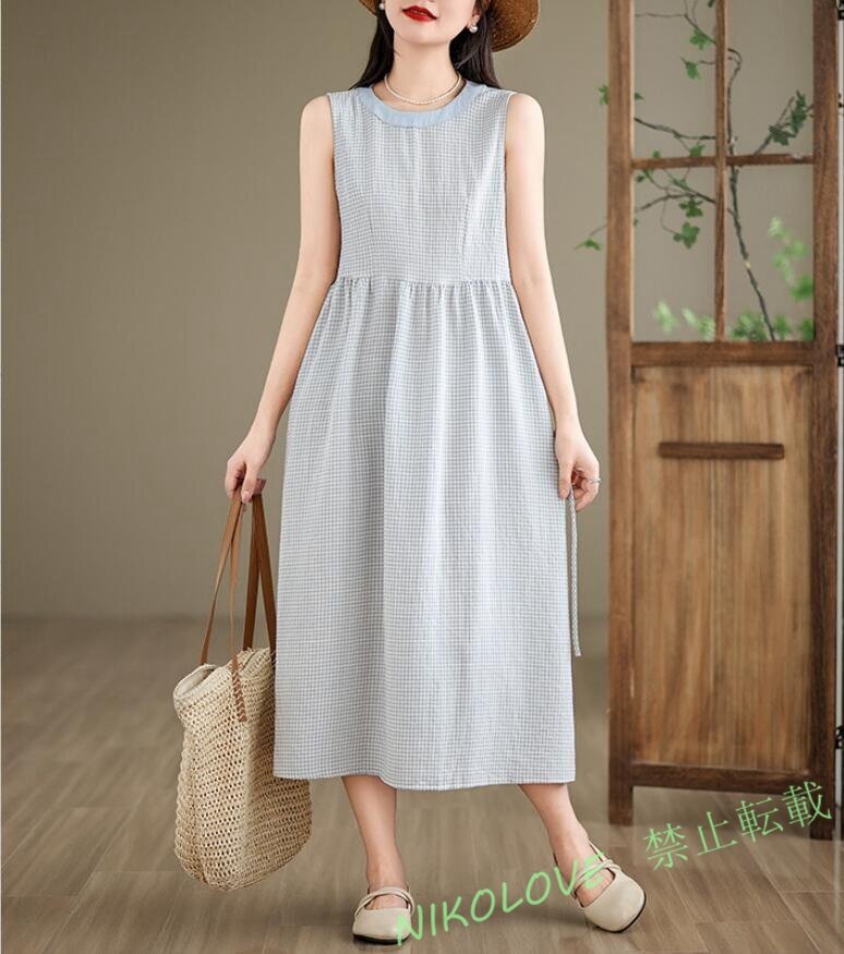 - 新品春夏ワンピース 綿麻風 レディースチェック柄 ロングワンピ ノースリーブ 大きいサイズ ナチュラル ゆったり 森ガール ブルー LH985