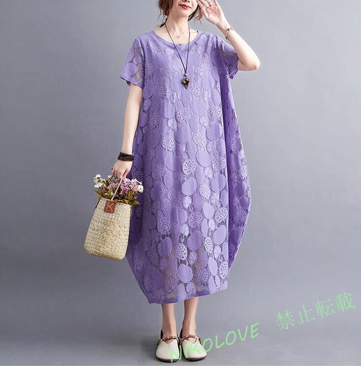 - 新品大人可愛い ワンピース レース 透かし彫り ロングワンピース 二次会 レディース 大きいサイズ ゆったり 体型カバー パープル LH922