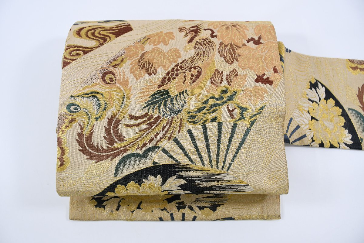 - 名古屋帯 アンティーク 扇子 鳥 花 帯丈380cm ★着物屋 ne-10942 桜庭呉服店