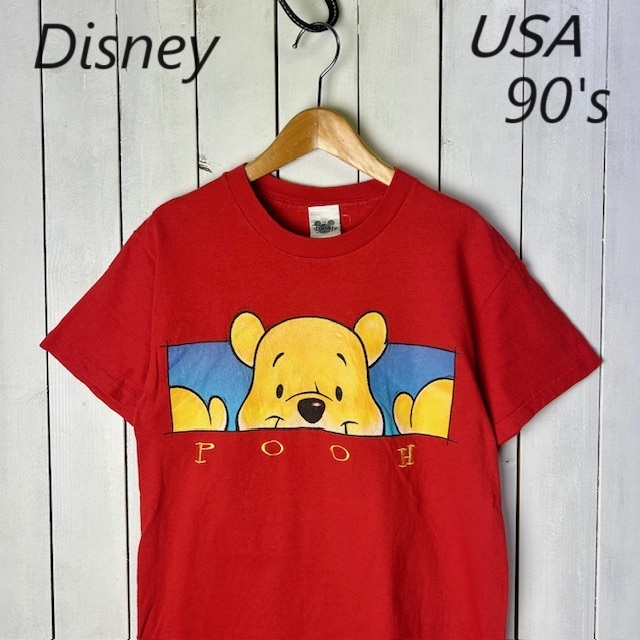 > T●383 USA古着 90s USA製 Disney プーさんTシャツ S 赤 オールド ヴィンテージ アメリカ くまのぷーさん ディズニー シングルステッチ