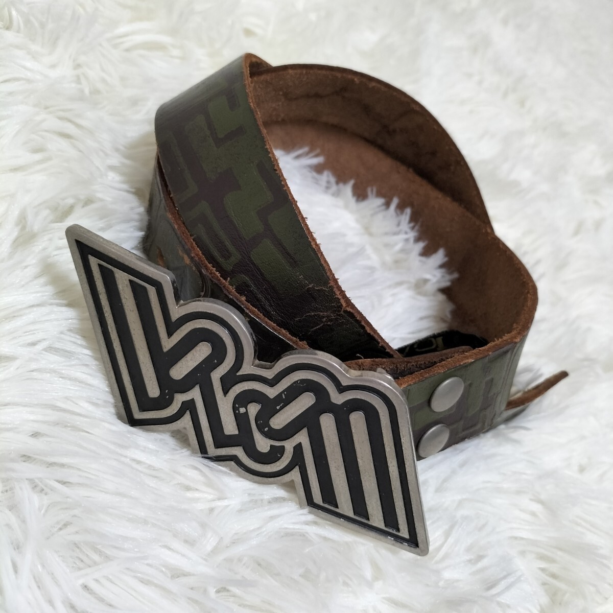 - ★VOLCOM ボルコム レザー ベルト ブランドネームロゴプレートバックル カーキ ブラウン 茶芯 牛革 本革 総柄 32INCH ブランド古着 USED