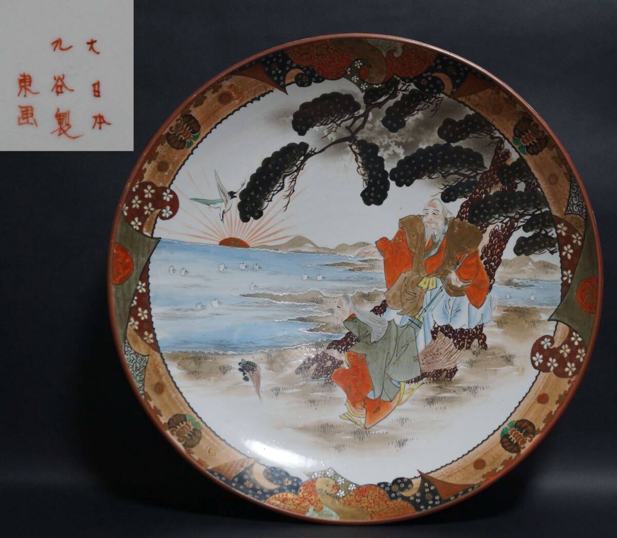 - 【閑】明治期 九谷焼 大日本九谷製 東画『高砂祥瑞文』飾り大皿 丸皿 大皿径45㎝ / 茶道具☆時代物☆6D0727■