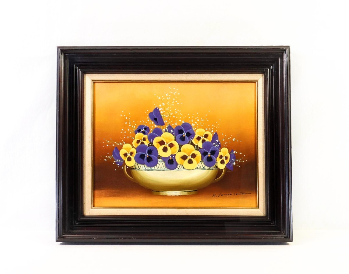 > 真作 山下克巳 油彩「パンジー」画寸 F6 岐阜県出身 無所属 元應美会会員 細やかな色彩描写 瑞々しく可憐で美しい三色スミレ 山下克己 9453